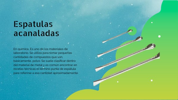 Referencias:Materiales de Laboratorio. 2021. ▷ Espátula de Laboratorio I➨ Materiales de laboratorio: <https://materialesdelaboratorio.info/espatula-de-laboratorio> [Accessed 19 September 2021]. Es.wikipedia.org. 2021. Espátula - Wikipedia, la enciclopedia libre: <https://es.wikipedia.org/wiki/Esp%C3%A1tula> [Accessed 19 September 2021]. Fishersci.es. 2021. Espátulas de laboratorio | Fisher Scientific: <https://www.fishersci.es/es/es/products/I9C8L40N/spatulas.html> [Accessed 19 September 2021].