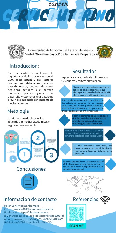 En este cartel se rectificara la importancia de la prevencion de el CCU, como actua; y que factores podrian ser detonantes para su descubrimiento, englobando como pequeñas acciones que parecen inofensivas pueden ayudar a su desarrollo y ccomo es una oatologia prevenible que suele ser causante de muchas muertes.
