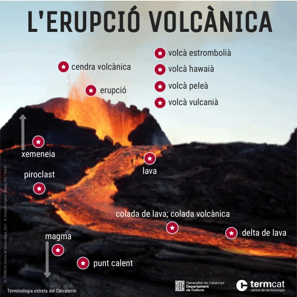 Projecció de lava, de gasos i de materials piroclàstics a través d'un cràter.