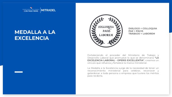 Fortaleciendo el proceder del Ministerio de Trabajo y Desarrollo Laboral que promueve lo que se denominaría "LA EXCELENCIA LABORAL - OPERIS EXCELLENTIA", creamos un vínculo que refuerza y fortalece la marca ministerial. La Medalla a la Excelencia surge de la necesidad de tener un reconocimiento ministerial para celebrar, reconocer y galardonar a toda persona o empresa que tuviera los méritos para recibirla.
