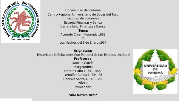Universidad de Panamá Centro Regional Universitario de Bocas del Toro Facultad de Economía Escuela Finanzas y Banca Carrera Linc. Finanzas y Banca Tema: Acuerdo Chiari -Kennedy 1962 Y Los Hechos del 9 de Enero 1964 Asignatura: Historia de la Relaciones Con Panamá de Los Estados Unidos II Profesora : Janelle García Integrantes: Harold Caito 1 -741- 2027 Yennifer García 1 -734 -88 Daniska Santo 1- 746 -1280 Nivel: Primer año *Año lectivo 2021*