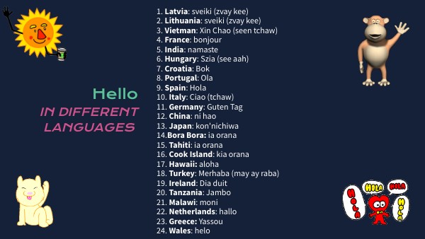 1. Latvia: sveiki (zvay kee)2. Lithuania: sveiki (zvay kee)3. Vietman: Xin Chao (seen tchaw)4. France: bonjour 5. India: namaste 6. Hungary: Szia (see aah) 7. Croatia: Bok 8. Portugal: Ola 9. Spain: Hola 10. Italy: Ciao (tchaw) 11. Germany: Guten Tag 12. China: ni hao 13. Japan: kon'nichiwa 14.Bora Bora: ia orana 15. Tahiti: ia orana 16. Cook Island: kia orana 17. Hawaii: aloha 18. Turkey: Merhaba (may ay raba) 19. Ireland: Dia duit 20. Tanzania: Jambo 21. Malawi: moni 22. Netherlands: hallo 23. Greece: Yassou 24. Wales: helo