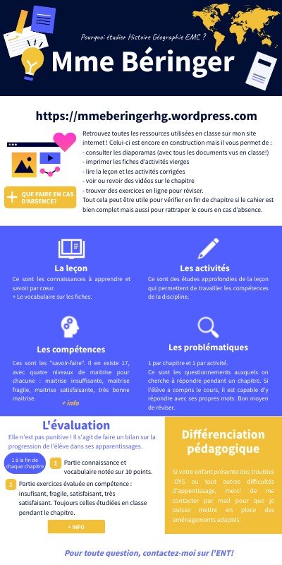 Retrouvez toutes les ressources utilisées en classe sur mon site internet ! Celui-ci est encore en construction mais il vous permet de : - consulter les diaporamas (avec tous les documents vus en classe!) - imprimer les fiches d’activités vierges - lire la leçon et les activités corrigées - voir ou revoir des vidéos sur le chapitre - trouver des exercices en ligne pour réviser. Tout cela peut être utile pour vérifier en fin de chapitre si le cahier est bien complet mais aussi pour rattraper le cours en cas d’absence.