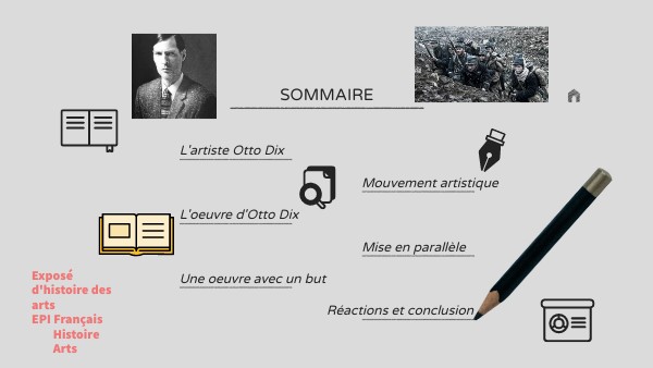 Otto Dix est issu de l'expressionnisme : c'est un mouvement artistique qui date du début du XXème siècle, il est apparu en Europe du Nord, pas de règles précises, mais une volonté de laisser l'artiste s'exprimer ses émotions propres. Caractéristiques : lignes épaisses et couleurs violentes : le tableau doit être fort en couleurs et en message. Otto Dix, comme Van Gogh par exemple, sont des grands artistes de ce mouvement.