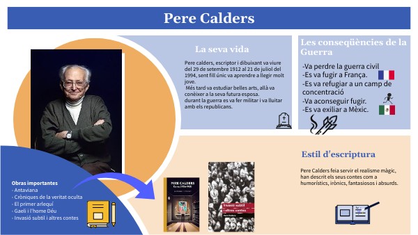 Pere calders, escriptor i dibuixant va viure del 29 de setembre 1912 al 21 de juliol del 1994, sent fill únic va aprendre a llegir molt jove. Més tard va estudiar belles arts, allà va conèixer a la seva futura esposa. durant la guerra es va fer militar i va lluitar amb els republicans.