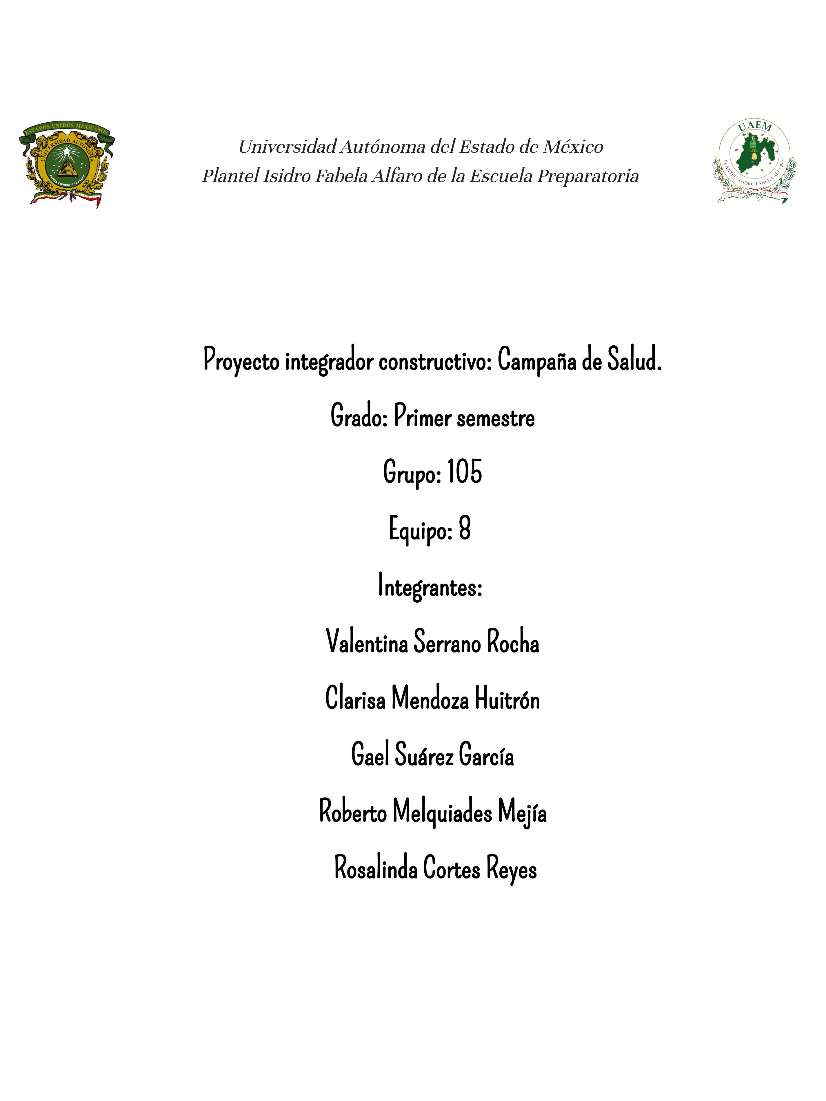 Proyecto integrador constructivo: Campaña de Salud. Grado: Primer semestre Grupo: 105 Equipo: 8 Integrantes: Valentina Serrano Rocha Clarisa Mendoza Huitrón Gael Suárez García Roberto Melquiades Mejía Rosalinda Cortes Reyes