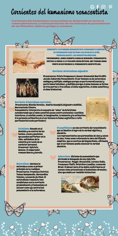 Epicureismo: Sistema de pensamiento que pretende la búsqueda de una vida feliz.Precursores: Poggio Bracciolini, Lorenzo Valla, Francesco Filelfo, Cristoforo Landino, Leonardo Bruni. El placer para él no debía conformarse al cuerpo como preconizado el hedonismo cirenaico, sino que debía ser también intelectual.