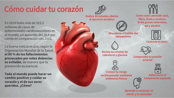 En 2019 hubo más de 523,2 millones de casos de enfermedades cardiovasculares en el mundo, un aumento del 26,6 por ciento en comparación con 2010. La buena noticia es que, según la Organización Mundial de la Salud, el 80 % de los fallecimientos provocados por estas dolencias es evitable, de manera que la prevención es esencial. Todo el mundo puede hacer un cambio positivo y cuidar su corazón y el de sus seres queridos. ¿Cómo?