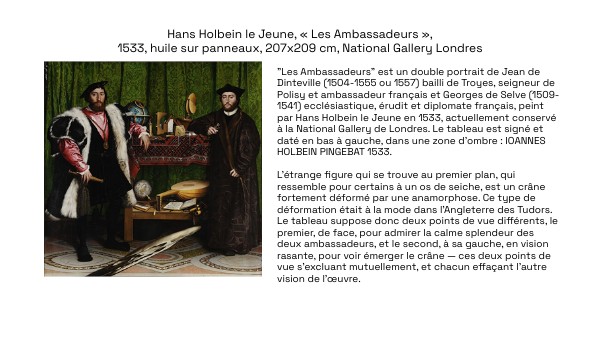 Le tableau suppose donc deux points de vue différents, le premier, de face, pour admirer la calme splendeur des deux ambassadeurs, et le second, à sa gauche, en vision rasante, pour voir émerger le crâne — ces deux points de vue s'excluant mutuellement, et chacun effaçant l'autre vision de l'œuvre.