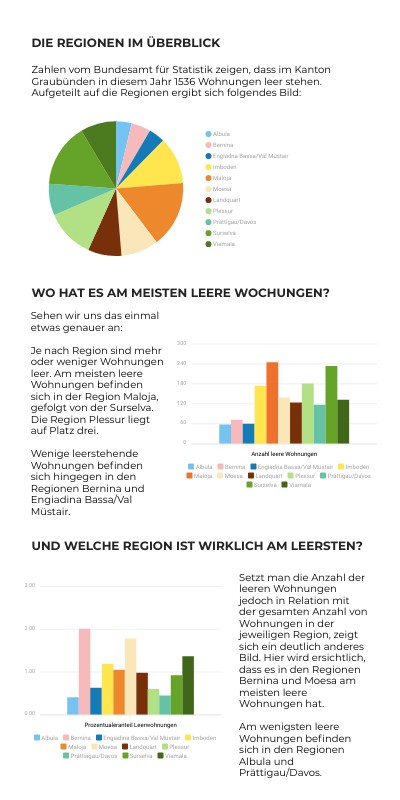 Setzt man die Anzahl der leeren Wohnungen jedoch in Relation mit der gesamten Anzahl von Wohnungen in der jeweiligen Region, zeigt sich ein deutlich anderes Bild. Hier wird ersichtlich, dass es in den Regionen Bernina und Moesa am meisten leere Wohnungen hat. Am wenigsten leere Wohnungen befinden sich in den Regionen Albula und Prättigau/Davos.