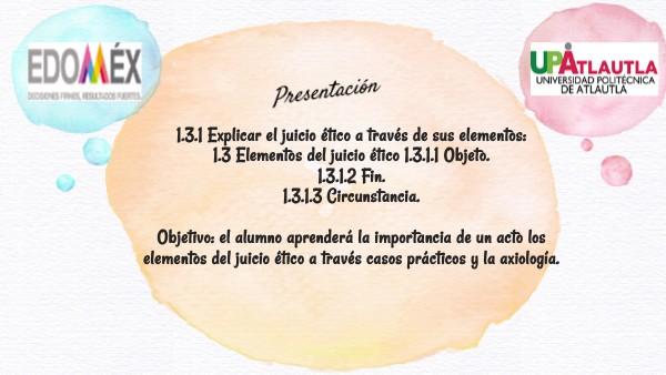 1.3.1 Explicar el juicio ético a través de sus elementos: 1.3 Elementos del juicio ético 1.3.1.1 Objeto. 1.3.1.2 Fin. 1.3.1.3 Circunstancia. Objetivo: el alumno aprenderá la importancia de un acto los elementos del juicio ético a través casos prácticos y la axiología.