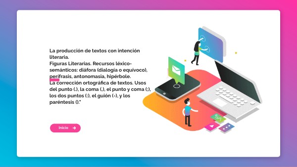 La producción de textos con intención literaria. Figuras Literarias. Recursos léxico-semánticos: diáfora (dialogía o equívoco), perífrasis, antonomasia, hipérbole. La corrección ortográfica de textos. Usos del punto (.), la coma (,), el punto y coma (;), los dos puntos (:), el guión (-), y los paréntesis ()."