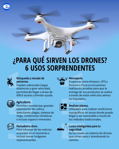 Mensajería. Empresas como Amazon, UPS y Domino’s Pizza se encuentran realizando pruebas para que la entrega de sus productos se realice a través de estos vehículos aéreos no tripulados. Realizar planos. Utilizados para realizar mediciones topográficas en zonas donde puede llegar a ser inaccesible a través de los métodos tradicionales. Luces inteligentes para tu seguridad. Se ha creado un sistema de drones que sirven para ir alumbrando tu camino.