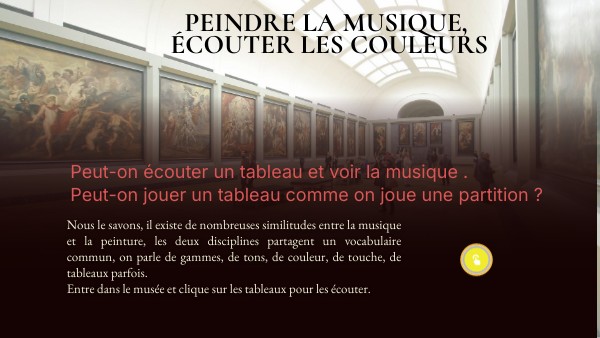 Nous le savons, il existe de nombreuses similitudes entre la musique et la peinture, les deux disciplines partagent un vocabulaire commun, on parle de gammes, de tons, de couleur, de touche, de tableaux parfois. Entre dans le musée et clique sur les tableaux pour les écouter.