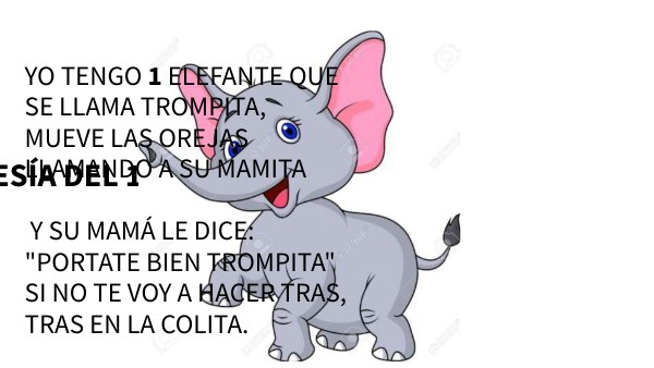 YO TENGO 1 ELEFANTE QUE SE LLAMA TROMPITA, MUEVE LAS OREJAS LLAMANDO A SU MAMITA Y SU MAMÁ LE DICE: "PORTATE BIEN TROMPITA" SI NO TE VOY A HACER TRAS, TRAS EN LA COLITA.