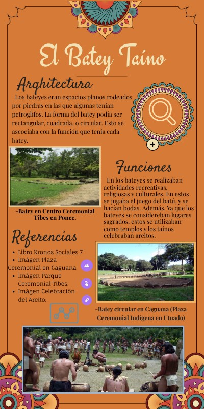 Los bateyes eran espacios planos rodeados por piedras en las que algunas tenían petroglifos. La forma del batey podía ser rectangular, cuadrada, o circular. Esto se ascociaba con la función que tenía cada batey.