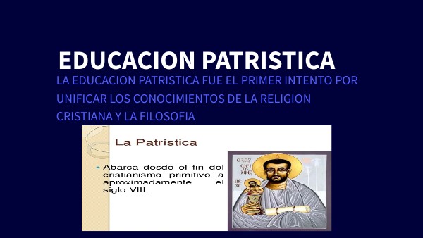 LA EDUCACION PATRISTICA FUE EL PRIMER INTENTO POR UNIFICAR LOS CONOCIMIENTOS DE LARELIGION CRISTIANA Y ESTABLECER EL CONTACTO DOCMATICO DE LA MISMA JUNTO CON LA FILOSOSFIA, A FIN DE DAR UNA EXPLICACION LOGICA DE LAS CREENCIAS CRISTIANAS Y DEFENDERLAS ANTE LOS DOGMAS,PAGANOS Y LAS EREJIAS