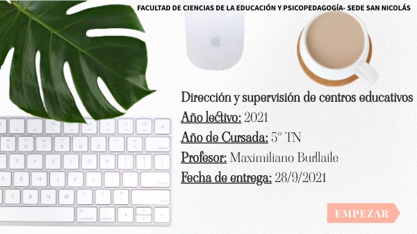 Dirección y supervisión de centros educativos Año lectivo: 2021 Año de Cursada: 5° TN Profesor: Maximiliano Burllaile Fecha de entrega: 28/9/2021