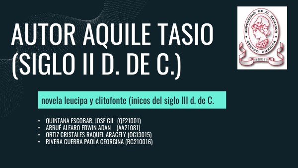 Segun parece, que Aquiles Tacio es dentro de la novela lo que Eurípides dentro del género trágico, se pude decir que es un autor que conoce y usa las convenciones del género, pero lo hace ya con una ironía y un realismo notables. Frente a la simplicidad de las novelas anteriores, Aquiles Tacio complica el esquema dentro de la armazón folletinesca de la novela griega, aburguesa a los protagonistas, y añade un buen montón de digresiones internas (descripciones de animales, estatuas, cuadros, relatos míticos, anécdotas, etc.) con un virtuosismo un tanto barroco. Aquiles Tacio Escritor griego de Alejandría, autor de Las aventuras de Leucipa y Clitofonte, novela de amor y aventuras de gran difusión durante la Edad Media.Aquiles Tacio fue considerado durante mucho tiempo como uno de los novelistas más tardíos, los recientes descubrimientos de un papiro milanés de finales del siglo II o comienzos del III d. de C. nos ha dado la seguridad de que vivió en el siglo II. Nació en Alejandría, ya que es llamado alejandrino por Suidas.