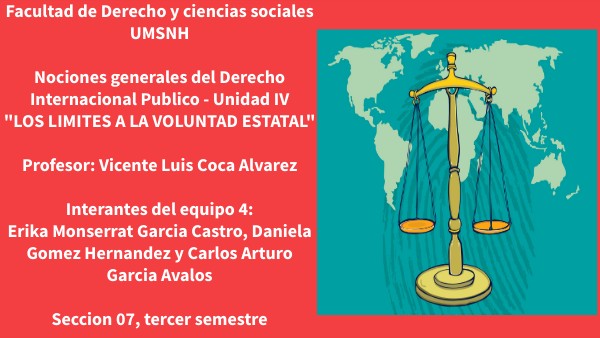Facultad de Derecho y ciencias sociales UMSNH Nociones generales del Derecho Internacional Publico - Unidad IV "LOS LIMITES A LA VOLUNTAD ESTATAL" Profesor: Vicente Luis Coca Alvarez Interantes del equipo 4: Erika Monserrat Garcia Castro, Daniela Gomez Hernandez y Carlos Arturo Garcia Avalos Seccion 07, tercer semestre