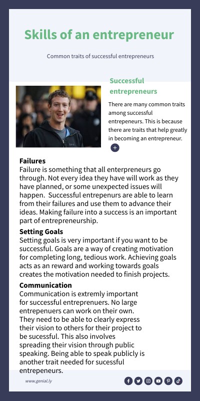 Communication Communication is extremly important for successful entreprenuers. No large entrepenuers can work on their own. They need to be able to clearly express their vision to others for their project to be sucessful. This also involves spreading their vision through public speaking. Being able to speak publicly is another trait needed for sucessful entrepeneurs.