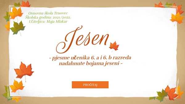 Svaki puta kada se sjetim na jesen u šumi padne jedan zreli kesten. U jesen počinje škola, počinje hladnoća i magle gustoća. Kiša tiho kaplje, granje se miče, kabanice su već pune kiše. Lišćem se puni trava, a jesen govori: "Ja sam jesen prava." Mateja Mišak, 6. b