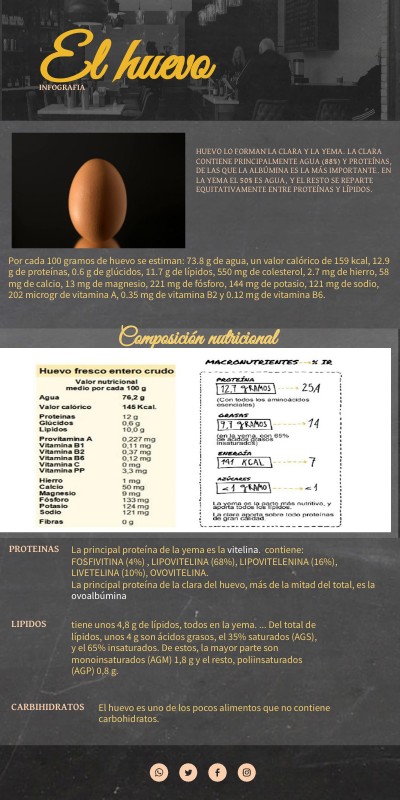 huevo lo forman la clara y la yema. La clara contiene principalmente agua (88%) y proteínas, de las que la albúmina es la más importante. En la yema el 50% es agua, y el resto se reparte equitativamente entre proteínas y lípidos.