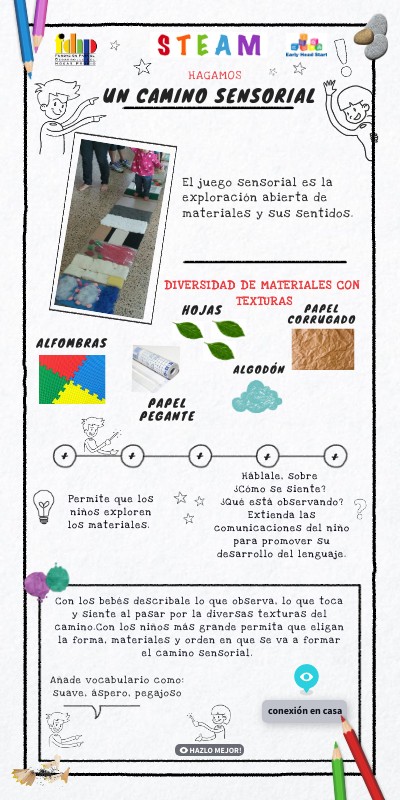 Con los bebés descríbale lo que observa, lo que toca y siente al pasar por la diversas texturas del camino.Con los niños más grande permita que eligan la forma, materiales y orden en que se va a formar el camino sensorial.
