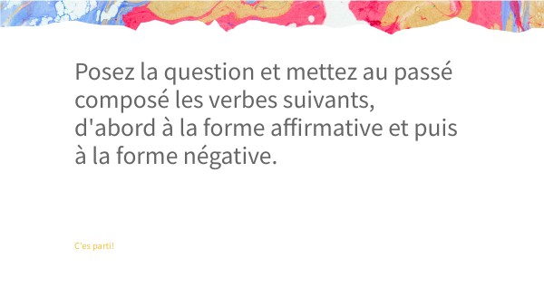 Posez la question et mettez au passé composé les verbes suivants, d'abord à la forme affirmative et puis à la forme négative.