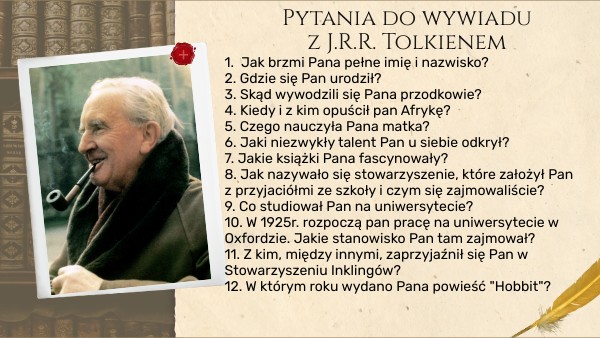 1. Jak brzmi Pana pełne imię i nazwisko? 2. Gdzie się Pan urodził?3. Skąd wywodzili się Pana przodkowie?4. Kiedy i z kim opuścił pan Afrykę?5. Czego nauczyła Pana matka?6. Jaki niezwykły talent Pan u siebie odkrył?7. Jakie książki Pana fascynowały?8. Jak nazywało się stowarzyszenie, które założył Pan z przyjaciółmi ze szkoły i czym się zajmowaliście?9. Co studiował Pan na uniwersytecie?10. W 1925r. rozpoczą pan pracę na uniwersytecie w Oxfordzie. Jakie stanowisko Pan tam zajmował?11. Z kim, między innymi, zaprzyjaźnił się Pan w Stowarzyszeniu Inklingów?12. W którym roku wydano Pana powieść "Hobbit"?
