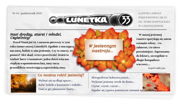 W naszej jesiennej Lunetce spotykają się zatem rozmaite teksty - i te zabawne, i te nieco poważniejsze. Zapraszamy do lektury, szczególnie w długie listopadowe wieczory...