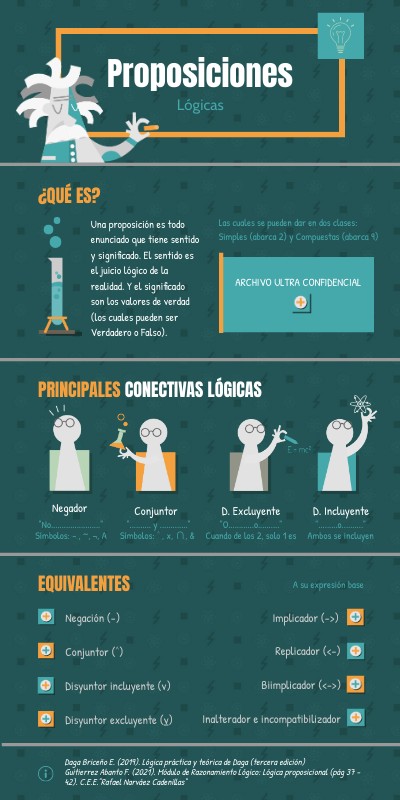 Daga Briceño E. (2019). Lógica práctica y teórica de Daga (tercera edición) Guitierrez Abanto F. (2021). Módulo de Razonamiento Lógico: Lógica proposicional (pág 37 - 42). C.E.E."Rafael Narváez Cadenillas"