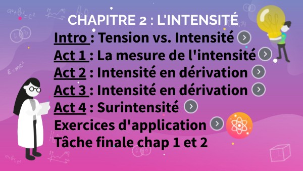 Intro : Tension vs. Intensité Act 1 : La mesure de l'intensité Act 2 : Intensité en dérivation Act 3 : Intensité en dérivation Act 4 : Surintensité Exercices d'application Tâche finale chap 1 et 2
