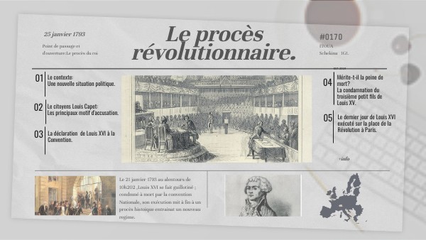 °Le procès (10-26 décembre) :Lors du procès c'est appuiyer 2évènement. Le rapport sur les 33 crimes imputésà Louis XVI (10 décembre),et le procès à la Convention: interrogatoire et défense de Louis XVI , avec ses avocats. °Le jugement (15 juillet 1793) avec de nombreux questions dont :