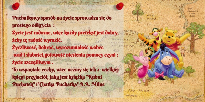 Puchatkowy sposób na życie sprowadza się do prostego odkrycia : Życie jest radosne, więc każdy pretekst jest dobry, żeby tę radość wyrazić. Życzliwość, dobroć, wyrozumiałość wobec wad i słabości,gotowość niesienia pomocy czyni :życie szczęśliwym . To wspaniałe cechy, więc uczmy się ich z wielkiej księgi przyjaciół, jaką jest książka "Kubuś Puchatek" i"Chatka Puchatka" A.A. Milne