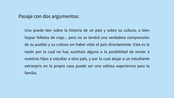 Uno puede leer sobre la historia de un país y sobre su cultura, o bien hojear folletos de viaje... pero 1 [no se tendrá una verdadera comprensión de su pueblo y su cultura sin haber visto el país directamente]. Esta es la razón por la cual 2 [no hay sustituto alguno a la posibilidad de enviar a nuestros hijos a estudiar a otro país], y por la cual 3 [alojar a un estudiante extranjero en la propia casa puede ser una valiosa experiencia para la familia].