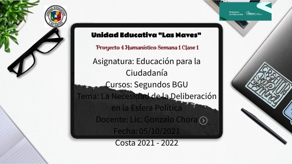 Asignatura: Educación para la Ciudadanía Cursos: Segundos BGU Tema: La Necesidad de la Deliberación en la Esfera Política Docente: Lic. Gonzalo Chora Fecha: 05/10/2021 Costa 2021 - 2022