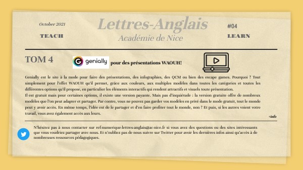 N’hésitez pas à nous contacter sur ref-numerique-lettres-anglais@ac-nice.fr si vous avez des questions ou des sites intéressants que vous voudriez partager avec nous. Et n’oubliez pas de nous suivre sur Twitter pour avoir les dernières infos ainsi qu’accès à de nombreuses ressources pédagogiques.