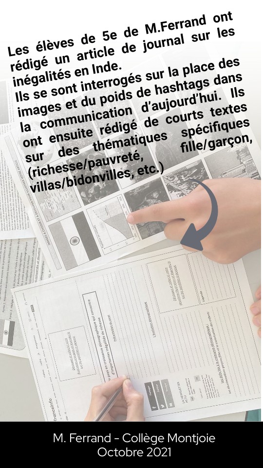 Les élèves de 5e de M.Ferrand ont rédigé un article de journal sur les inégalités en Inde. Ils se sont interrogés sur la place des images et du poids de hashtags dans la communication d’aujourd’hui. Ils ont ensuite rédigé de courts textes sur des thématiques spécifiques (richesse/pauvreté, fille/garçon, villas/bidonvilles, etc.)