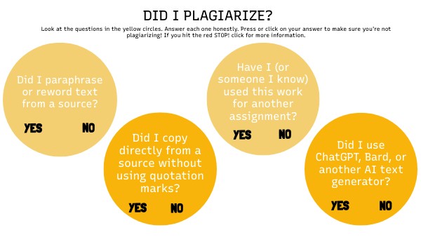 Look at the questions in the yellow circles. Answer each one honestly. Press or click on your answer to make sure you're not plagiarizing! If you hit the red STOP! click for more information.