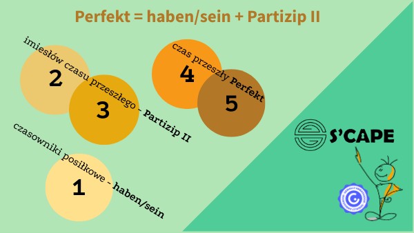 Zakręć strzałką i wylosuj. Zajrzyj do wylosowanego znaku zapytania, podaj Partizip II ukrytego tam czasownika i ułóż z nim zdanie w czasie przeszłym Perfekt.