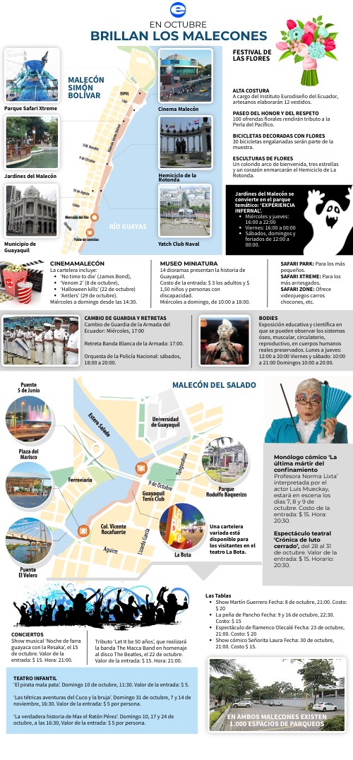 ALTA COSTURA A cargo del Instituto Eurodiseño del Ecuador, artesanos elaborarán 12 vestidos. PASEO DEL HONOR Y DEL RESPETO 100 ofrendas florales rendirán tributo a la Perla del Pacífico. BICICLETAS DECORADAS CON FLORES 30 bicicletas engalanadas serán parte de la muestra. ESCULTURAS DE FLORES Un colorido arco de bienvenida, tres estrellas y un corazón enmarcarán el Hemiciclo de La Rotonda.