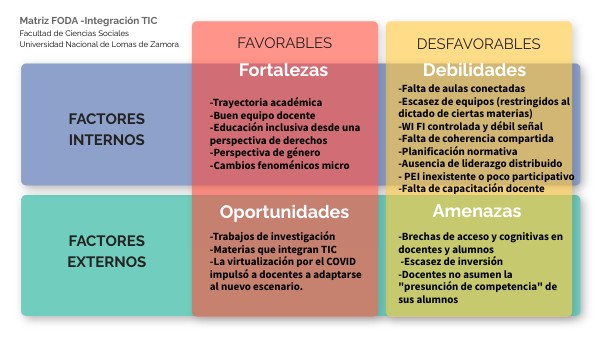 -Falta de aulas conectadas-Escasez de equipos (restringidos al dictado de ciertas materias) -WI FI controlada y débil señal -Falta de coherencia compartida -Planificación normativa -Ausencia de liderazgo distribuido - PEI inexistente o poco participativo -Falta de capacitación docente