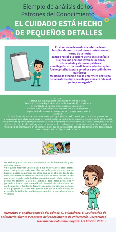 Este patrón puede identificarse en el conocimiento que el enfermero tenía acerca de la patología, las implicaciones del tratamiento y el procedimiento que posibilitó que él tuviera la capacidad de explicar y preparar emocionalmente a la paciente que iba a ser sometida a esta intervención. La ejecución de procedimientos y protocolos de manejo fue también una señal inequívoca de su experticia técnica y su nivel de competencia profesional en este servicio. La riqueza de este patrón está en reconocer el conocimiento de las teorías de enfermería que estructuran la disciplina, que en este caso podrían ser las teorías de rango medio, por ejemplo, la teoría de Incertidumbre ante la enfermedad de Mishel, cuando el enfermero se dio cuenta de que la actitud aparentemente apática y retraída de Elena, obedecía a un estado emocional que requería una intervención de información y entendimiento de la situación de salud y su tratamiento por parte de la paciente. El contacto de la familia para reforzar el soporte social fue fundamental para lograr la adaptación y el afrontamiento efectivo de su condición prequirúrgica y posquirúrgica. También la teoría de Confort de Kolcaba, que propone intervenciones activas, pasivas o cooperativas para satisfacer las necesidades humanas, aliviarlas y facilitar o trascender en las situaciones estresantes relativas al cuidado de la salud, podría considerarse para nutrir el análisis desde una perspectiva teórica. Se puede ver que el enfermero se enfocó en las necesidades básicas que incluyeron no solo las necesidades físicas, sino que también consideró satisfacer las necesidades de tipo emocional, atendiendo a las fuentes estresantes de mayor importancia en este caso, como fueron la incertidumbre por su enfermedad y el temor a no volver a ver a sus hijos ante el riesgo de muerte. Lo que posibilitó enfrentar su estrés fue la oportunidad de comunicarse con su familia y estar con ella en los momentos que más lo necesitó. El uso del conocimiento empírico en esta situación se enriquece mediante el conocimiento personal, ya que a través de relaciones terapéuticas con conocimiento fundamentado se posibilita este tipo de crecimiento.
