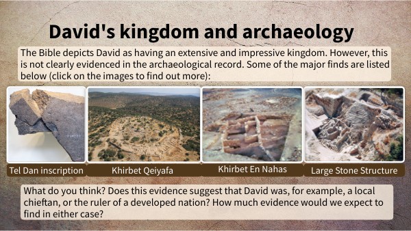 The Bible depicts David as having an extensive and impressive kingdom. However, this is not clearly evidenced in the archaeological record. Some of the major finds are listed below (click on the images to find out more):