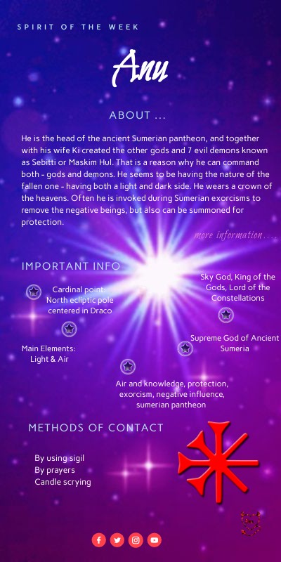 He is the head of the ancient Sumerian pantheon, and together with his wife Ki created the other gods and 7 evil demons known as Sebitti or Maskim Hul. That is a reason why he can command both - gods and demons. He seems to be having the nature of the fallen one - having both a light and dark side. He wears a crown of the heavens. Often he is invoked during Sumerian exorcisms to remove the negative beings, but also can be summoned for protection.