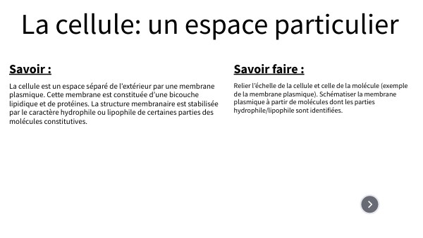 Relier l’échelle de la cellule et celle de la molécule (exemple de la membrane plasmique). Schématiser la membrane plasmique à partir de molécules dont les parties hydrophile/lipophile sont identifiées.