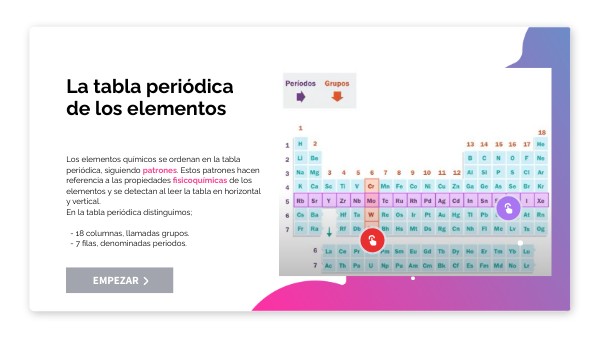 Los elementos químicos se ordenan en la tabla periódica, siguiendo patrones. Estos patrones hacen referencia a las propiedades fisicoquímicas de los elementos y se detectan al leer la tabla en horizontal y vertical.En la tabla periódica distinguimos; - 18 columnas, llamadas grupos. - 7 filas, denominadas periodos.