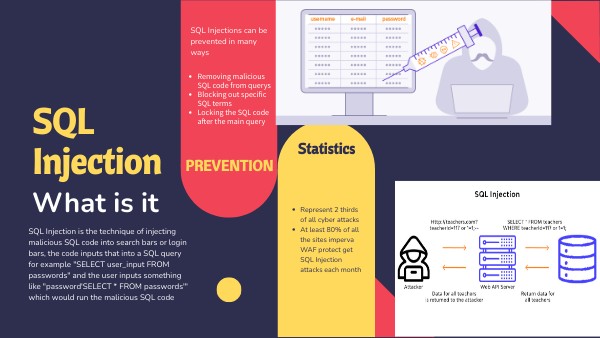 SQL Injection is the technique of injecting malicious SQL code into search bars or login bars, the code inputs that into a SQL query for example "SELECT user_input FROM passwords" and the user inputs something like "password'SELECT * FROM passwords'" which would run the malicious SQL code