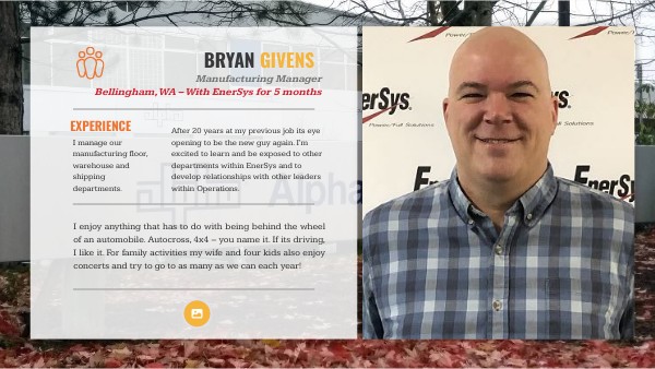 After 20 years at my previous job its eye opening to be the new guy again. I'm excited to learn and be exposed to other departments within EnerSys and to develop relationships with other leaders within Operations.